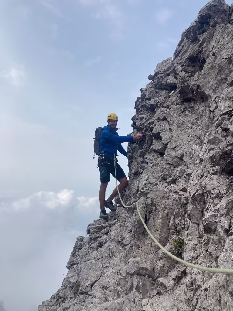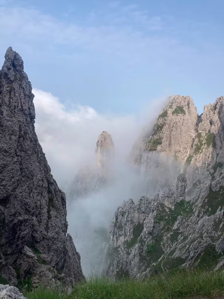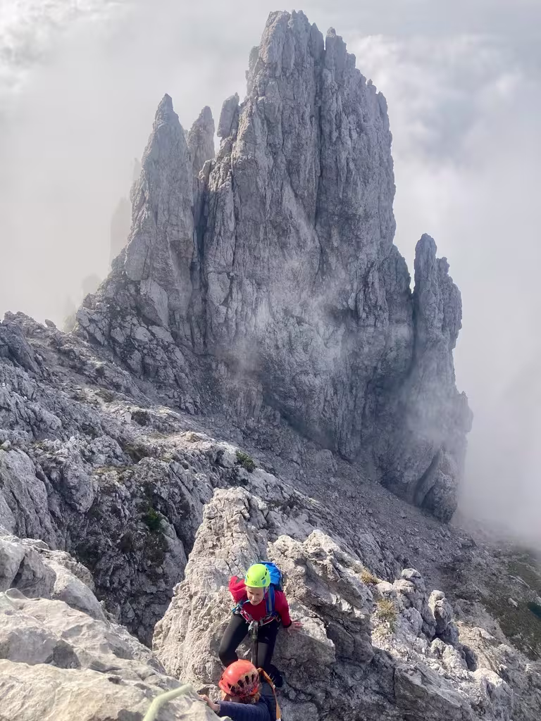 Si aggirano delle torri e si scende in un intaglio per salire la parete opposta. Si raggiunge poi un cengione, siamo oramai sul versante Nord.