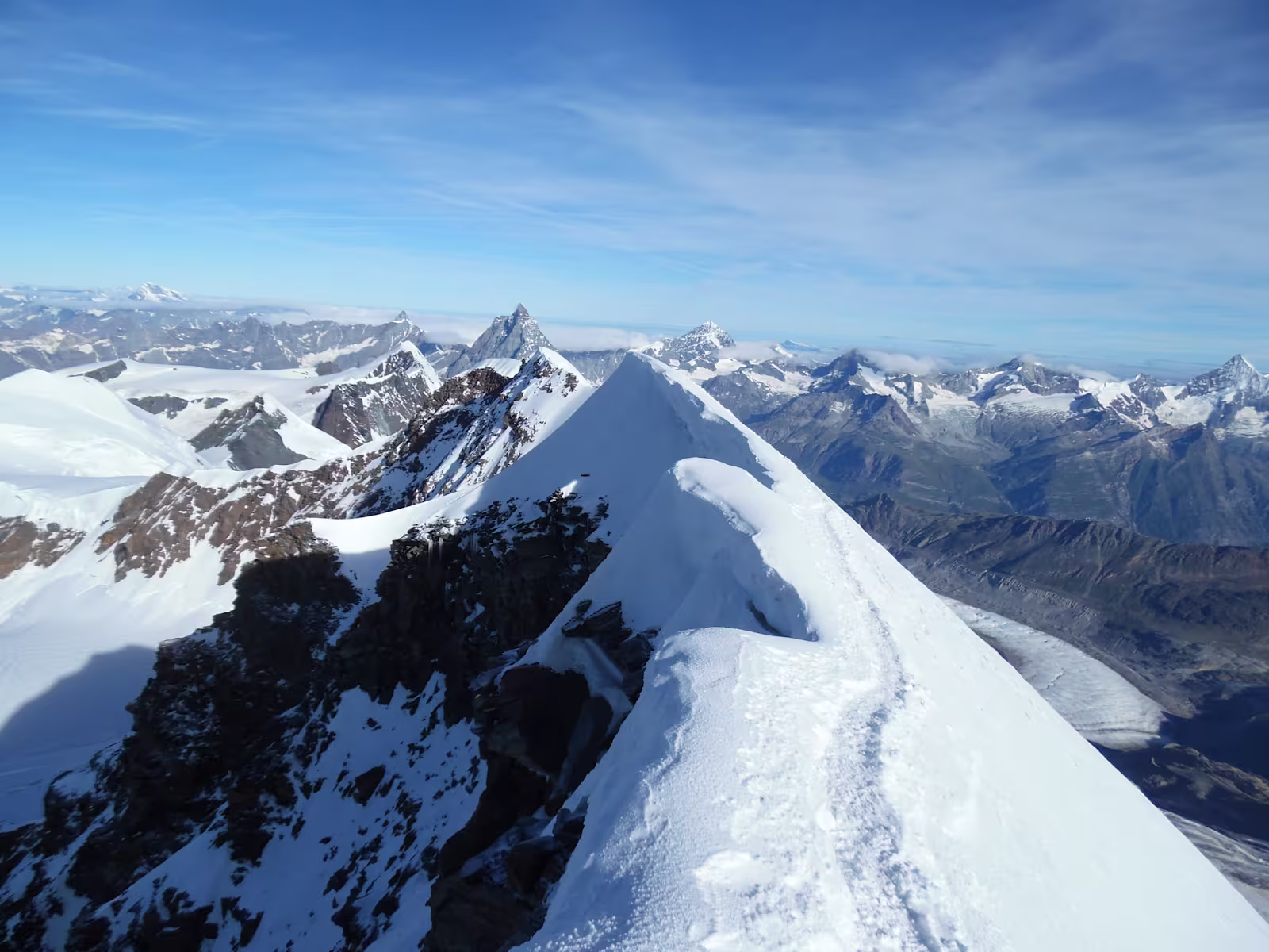 Partenza alle 4,00 del mattino, attraverso il ghiacciaio del Garstelet e il ghiacciaio del Lys fino all’omonimo colle mt 4157, da cui inizia la cresta. Ripida e affila sale fino alla vetta del Lyskamm orientale mt 4527. (ore 3,30 circa). La traversata si fa poi più semplice fino alla sella dei Lyskamm mt 4450, per poi divenire nuovamente tecnica ed esposta fino alla cima del Lyskamm occidentale mt 4480.
