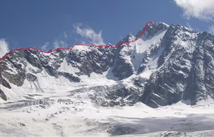 Dal bivacco si risale il dolce pendio costeggiando le rocce. Si supera la crepacciata terminale nel punto più agevole e con un tratto più ripido si sale in cresta. Il percorso qui è chiaro: si segue la cresta cercando il percorso più facile. Nella prima parte si alternano salti rocciosi con passi di II e III grado, a tratti con neve e ghiaccio. La seconda parte, invece, è caratterizzata da sottili e affilate crestineche portano alla base della scimitarra: una bella cresta nevosa con pendenza sempre maggiore (40/45°). Prima di questo tratto è probabilmente possibile uscire a sinistra sul ghiacciaio. Si raggiunge la base del tratto roccioso finale (sosta a spit delle doppie). Si traversa verso sinistra e si sale cercando la via più comoda (II° e III°), tendenzialmente più ci si sposta a sinistra più è facile. Si raggiunge il Bivacco Rauzi e in breve, su terreno facile, la vetta mt 3678 m – 5 h).