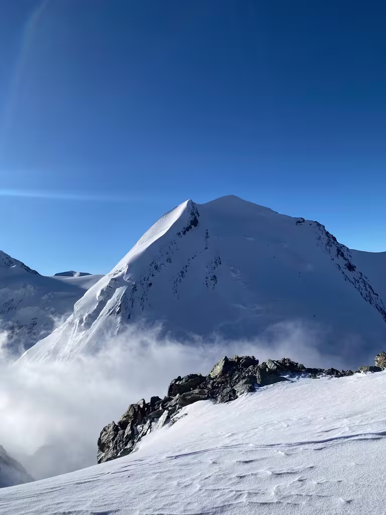 La salita al Polluce si svolge per la prima parte su terreno misto e roccia (II° max), in parte attrezzata da catene fisse sulla porzione finale. Per raggiungere la vetta dovremo invece calzare nuovamente i ramponi per percorrere l’estetica cresta nevosa sommitale.